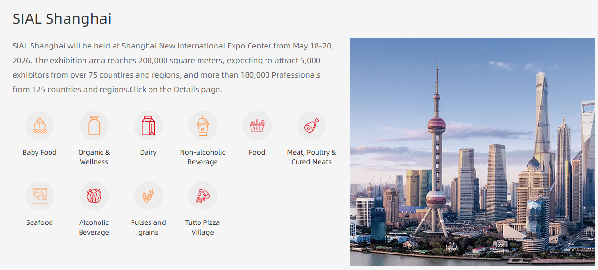 SIAL CHINA 현재 '아시아 최대 식음료 무역 박람회'로 성장하였고, 식품 원료 및 첨가물, 신선식품, 가공식품, 음료 등이 전시